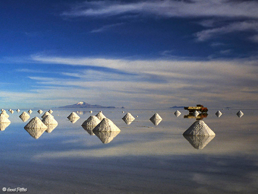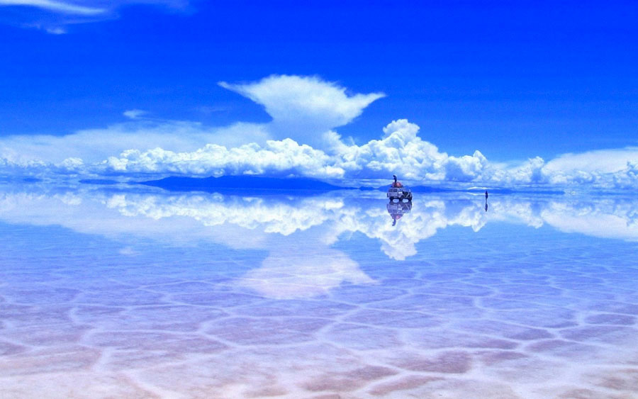 El Salar de Uyuni (o Salar de Tunupa) en Bolivia es el mayor desierto de sal del mundo, mide la friolera de 4 kilómetros cuadrados. Como su nombre indica, el Salar de Uyuni es extraordinariamente plano, con variaciones en su nivel de altitud que varían un máximo de un metro. Durante la estación de lluvia, el suelo está cubierto por una capa de agua poco profunda. En esos momentos, si alguien se situa sobre el salar aparece como si estuviera caminando sobre el agua.