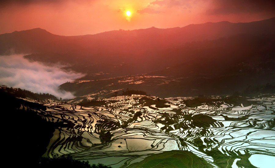 Las terrazas de arroz de Yuanyang tapizan la ladera sur de la montaña Ailao en Yuanyang, China. Yuanyang es la tierra de la etnia Hani de los últimos 2.500 años. Este increíble paisaje evolucionó a partir de la ingenuidad humana y el amor por la belleza artística. Con una superficie de más de 28.000 hectáreas, los campos de arroz y otros tipos de vegetación son tan amplios como estéticamente fascinantes.