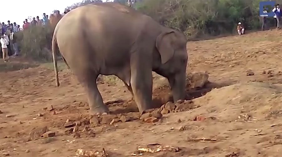 Una elefanta asiática luchó para rescatar a su pequeño bebé que había quedado atrapado en un profundo pozo en el distrito Chatra de la India. Un grupo de aldeanos se encontró con la frenética madre tratando de llegar hasta su bebé, pero sólo conseguía empujar más barro al agujero.