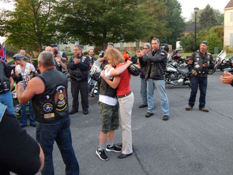 Los vecinos salieron de sus casas, uno por uno, para presenciar el increíble momento en que Sean conoció a sus nuevos amigos motoristas.