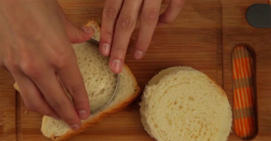 Utilice un cortador de galletas para cortar círculo de 6 rebanadas de pan.