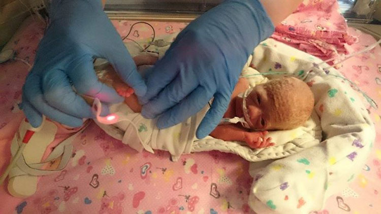 La niña era tan pequeña como la mano de su madre y pesó sólo 500 gramos al nacer. Tan pronto como Pixie nació, el personal médico de inmediato la pusieron y la envolvieron en una bolsa de plástico para mantenerla caliente y se apresuraron a cuidarla de forma intensiva.