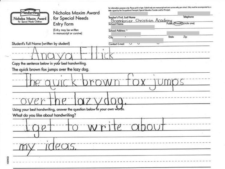 Anya estaba compitiendo por la ‘Excelencia de caligrafía en manuscrito’ premio que es para los estudiantes con ‘un retraso cognitivo, o una discapacidad intelectual, física, o de desarrollo.’