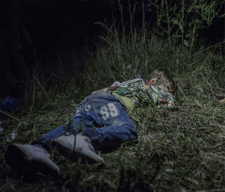 Después de la medianoche, Ahmed se queda dormido sobre la hierba. Los adultos todavía están sentados alrededor, contando planes para encontrar la forma en que podrán salir de Hungría sin que las autoridades los detengan. Ahmed tiene seis años y lleva su propia bolsa durante las largas caminatas que hace junto a su familia. «Es valiente y sólo llora a veces por las noches«, dice su tío, que es quien cuida de Ahmed, ya que su padre fue asesinado en su ciudad natal Deir ez-Zor, al norte de Siria.
