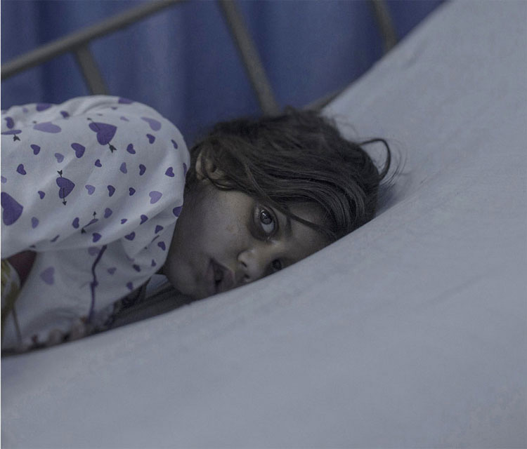 Maram, de ocho años, acababa de llegar de la escuela cuando un cohete cayó en su casa. Un pedazo del techo cayó justo sobre ella. Su madre la llevó a un hospital de campaña, y de allí fue trasladada por aire a través de la frontera con Jordania. El traumatismo craneal le causó una hemorragia cerebral. Durante los primeros 11 días, Maram estuvo en coma. Ella ahora está consciente, pero tiene una fractura de mandíbula y no puede hablar.