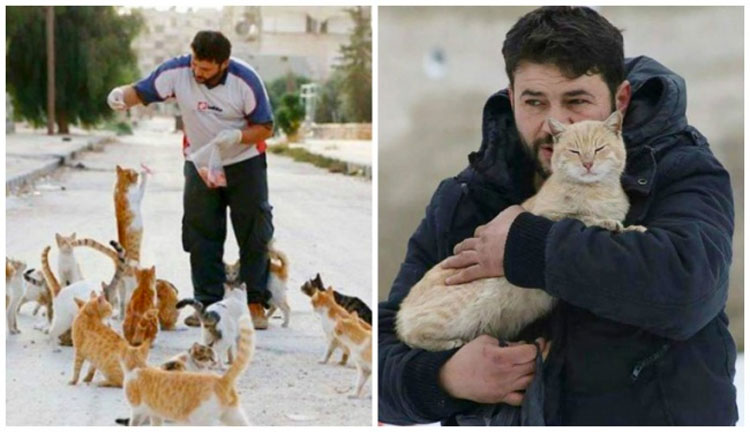 Alaa Jaleel estuvo arriesgando su vida todos los días con un único objetivo: proporcionar a los necesitados comida y refugio. Cuando la mayoría de sus vecinos, familiares y amigos salieron de la ciudad, este hombre decidió quedarse en Alepo con el fin de cuidar de sus mascotas abandonadas. Hoy en día, Alaa se ocupa de más de un centenar de felinos, incluyendo un gatito llevado por una niña cuya familia se vio obligado a abandonar el país. «Le prometí a esa chica que volvería a ver a su gato de nuevo cuando regresara«, dice.