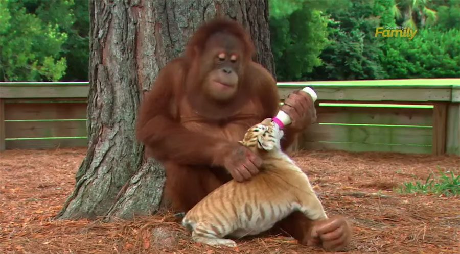 En Myrtle Beach Safari, Carolina del Sur (EEUU), un orangután vio como los cuidadores se ocupaban de unos adorables cachorros de tigre y decidió que él también podía hacerlo.
