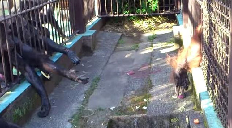Ninguno de estos animales tiene elección sobre su cautiverio, pero con la pequeña libertad de movimiento que este orangután puede permitirse, ha decidido utilizarla para mostrar bondad a las criaturas.