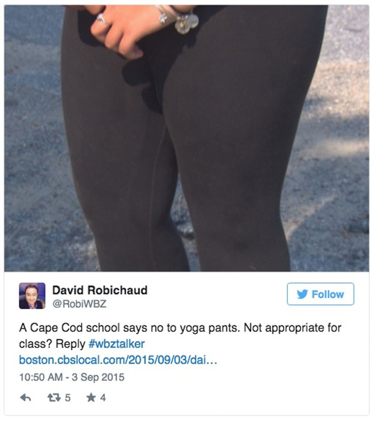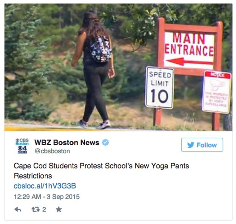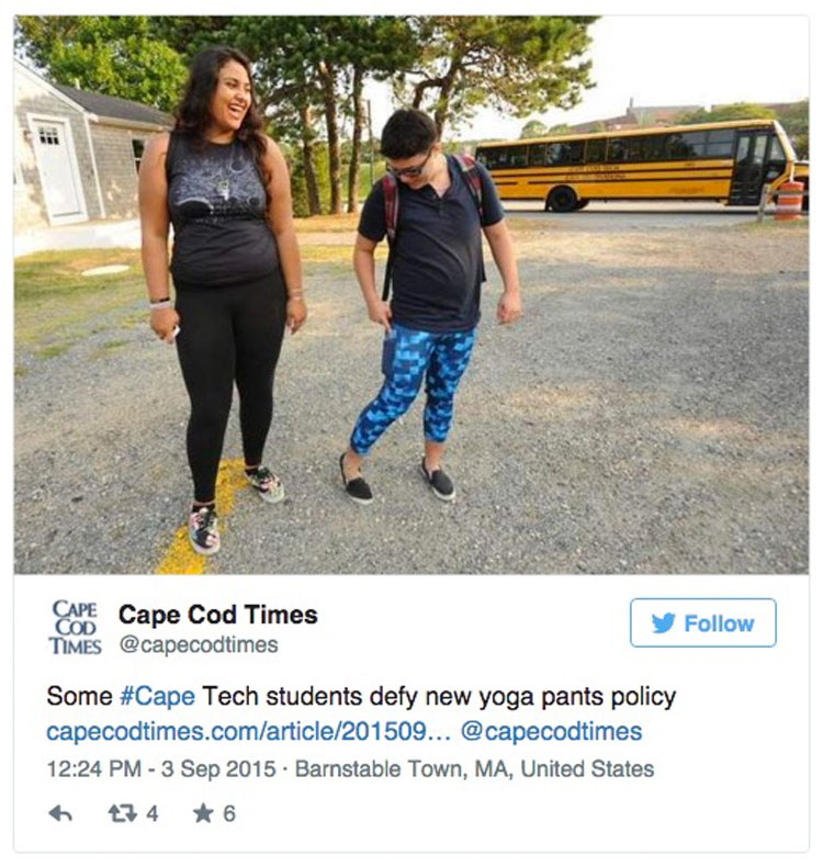 Cuando la facultad en Cape Cod Tech regional de Harwich (Estados Unidos), puso en marcha un nuevo código de vestimenta que prohíbe los pantalones de yoga (o leggings), sus estudiantes protestaron la decisión, afirmando que la regla promueve la vergüenza del cuerpo: