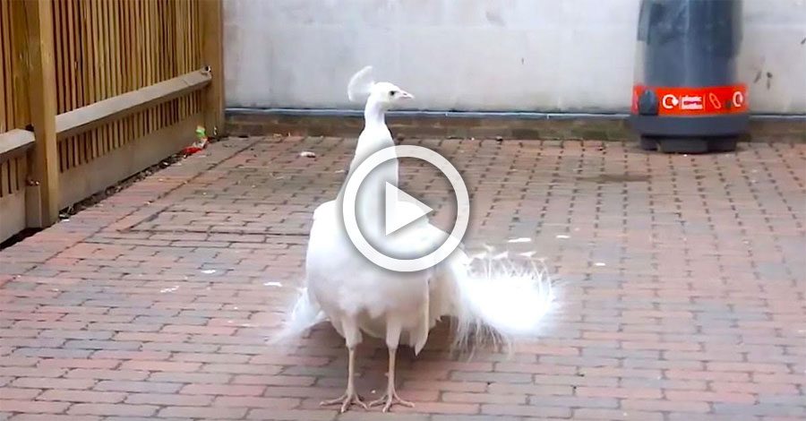 La magnífica ave que estás a punto de ver carece de plumas de colores, ya que ha perdido su pigmentación. Sin embargo, sus ojos son de color azul – un verdadero pavo real albino tendría los ojos rojizos. Este pavo real tiene una mutación genética llamada «leucismo», que provoca una disminución de pigmento que, en el caso de los pavos reales, provoca una falta total de pigmento en el plumaje, pero todavía lo deja con los ojos azules.