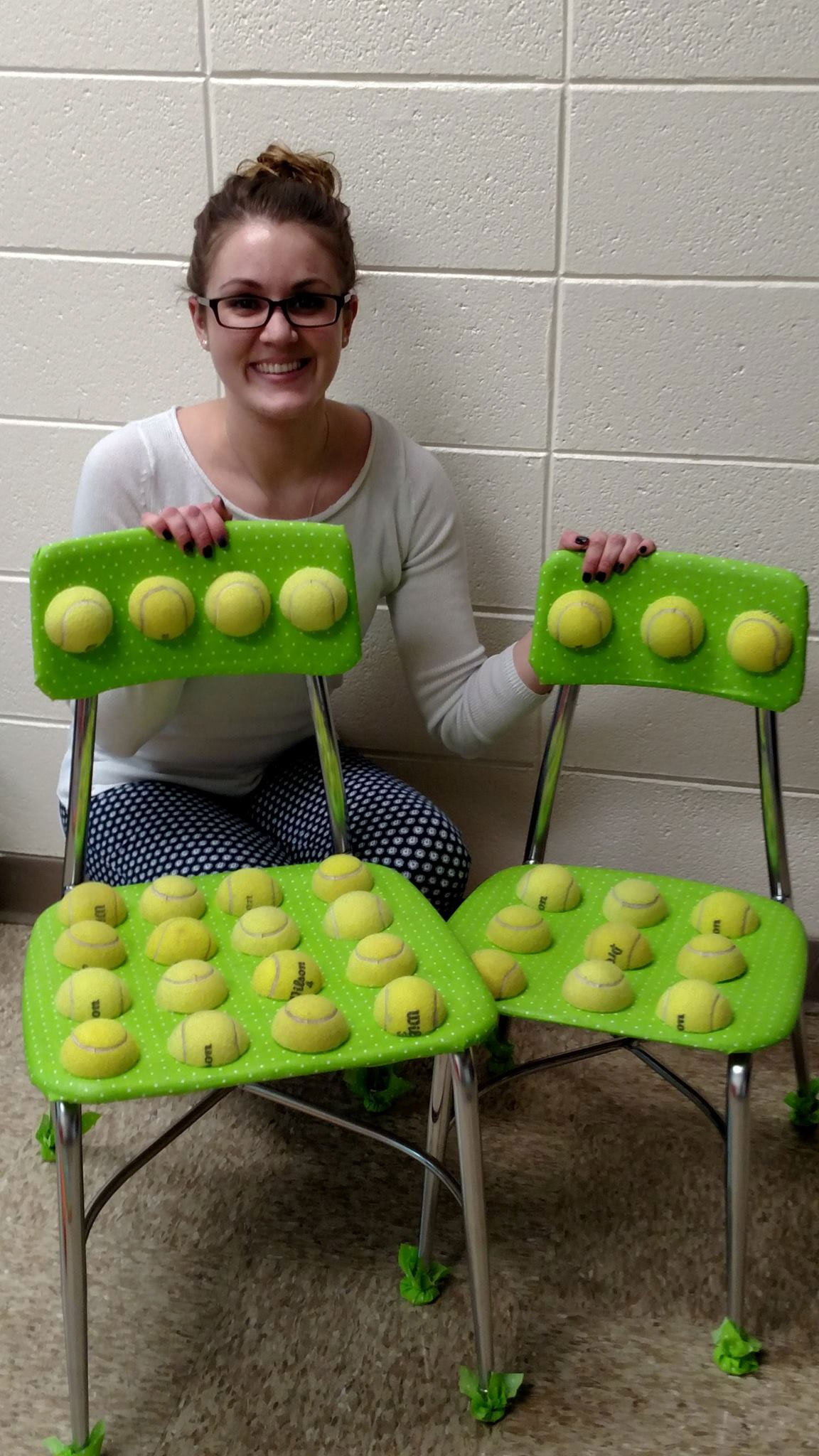 Amy Maplethorpe, patóloga del habla y el lenguaje en la Escuela Primaria Ellis Raymond en Round Lake, Illinois (EE.UU.), utiliza pegamento para unir las mitades de pelotas de tenis en el respaldo y el asiento de las sillas de la sala sensorial de la escuela. Amy dijo a The Huffington Post que las sillas son útiles para muchos niños que tienen dificultades para regular la percepción sensorial dentro de su cuerpo y de su entorno. Algunos de los diagnósticos de esos estudiantes incluyen autismo, síndrome de Down y trastorno del procesamiento sensorial.