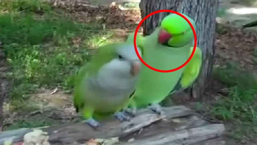 Mientras que la cotorra se queda mirándolo algo molesta, el perico se le pone pegado a ella de una manera hilarante que nos hace recordar a un comportamiento casi humano. El perico se acerca a ella, y se le pega a la cabeza y parece que le esté diciendo: ¿Me das un beso? Algo que hace con insistencia… y la cotorra parece querer ignorarlo o decir: ¡Qué pesado es! Un comportamiento similar al que podríamos observar una noche cualquier en uno de nuestros bares… Y todo ello mientras el perico emite unos sonidos absolutamente divertidos. ¡Hay que verlos y escucharlos!