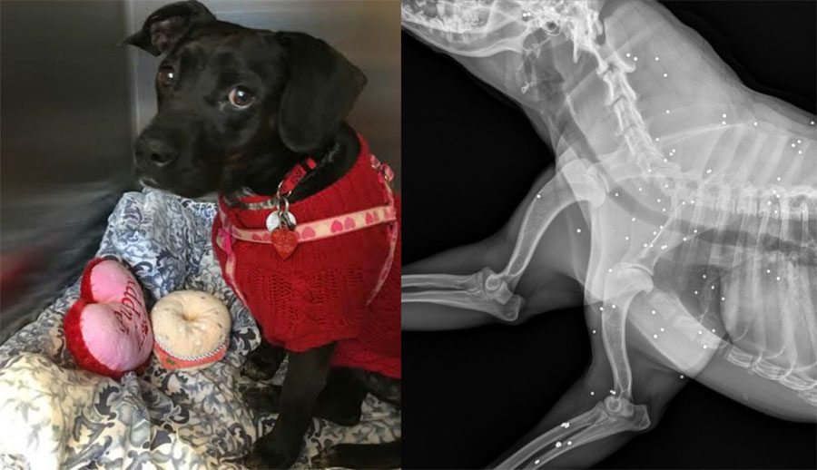 «En el examen, los veterinarios sintieron un par de pequeñas protuberancias en su cuerpo«, dijo Szczudlo. «Hicimos una placa de rayos X y se descubrió que la pobre Mama estaba llena de perdigones, por lo que probablemente por eso, estaba tan temerosa cuando estaba al aire libre. Alguien debió haberle disparado con perdigones.»