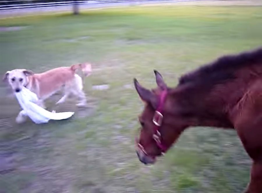 A lo largo del vídeo, el perro juega con el caballo mientras sostiene una tela blanca en la boca. Al principio incluso se involucran en un pequeño juego de «a ver si me atrapas». Pero sólo tiene que esperar a ver lo que hace el caballo en el segundo 00:18.