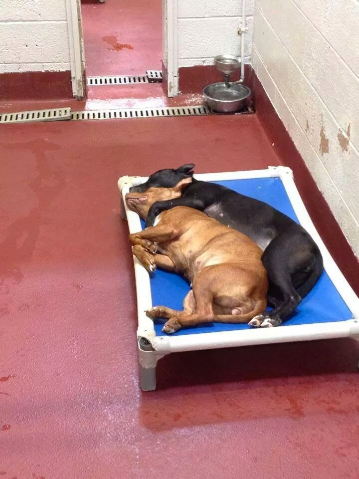 Delaware, mezcla de pit bull, y Kyra, se convirtieron en compañeros de habitación en el refugio Fulton Country Animal Services de Atlanta, EEUU.