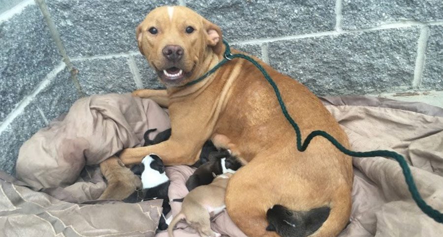Habían dejado en su puerta a una nueva madre pitbull y a sus 10 pequeños bebés. El dueño no estaba a la vista.