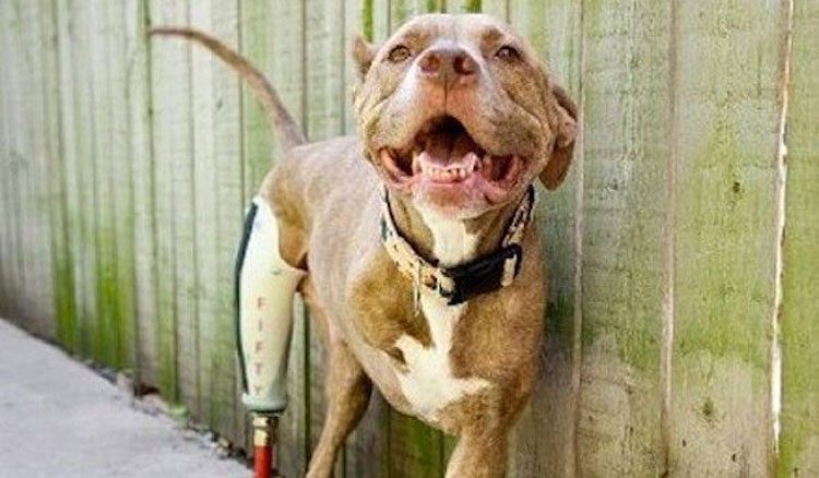 Conoce al pitbull Fifty. Él sólo tiene sus dos patas izquierdas después de que un policía le disparara cuando él y su hermano estaban husmeando en un callejón detrás de su casa. Fifty no estaba atacando a nadie ni causaba ningún problema, simplemente era un pitbull, y le dispararon dos veces.