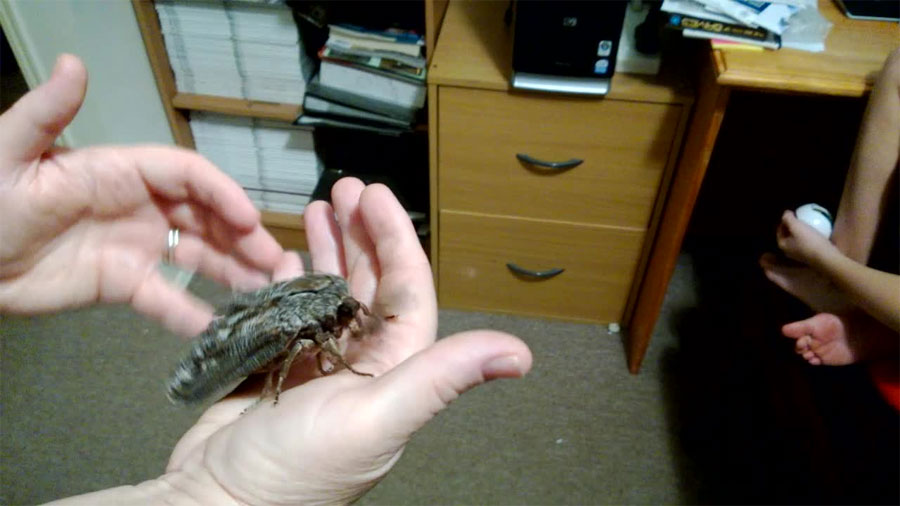 El vídeo de esta extraña y enorme polilla ha sido visto más de 30 millones de veces y ha aparecido en los medios de comunicación en 34 países diferentes. Se trata de una especie de polilla (Sphinx ligustri) que puede medir hasta 12 centímetros.