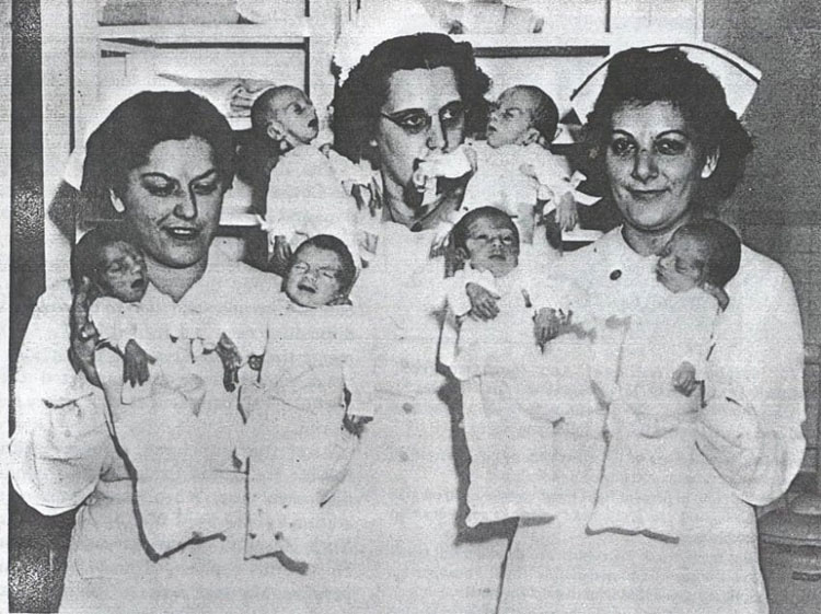 Estas enfermeras muestran algunos bebés «graduados» en la Feria Mundial de 1939 en Nueva York. La enfermera del centro es la hija del doctor Couney.