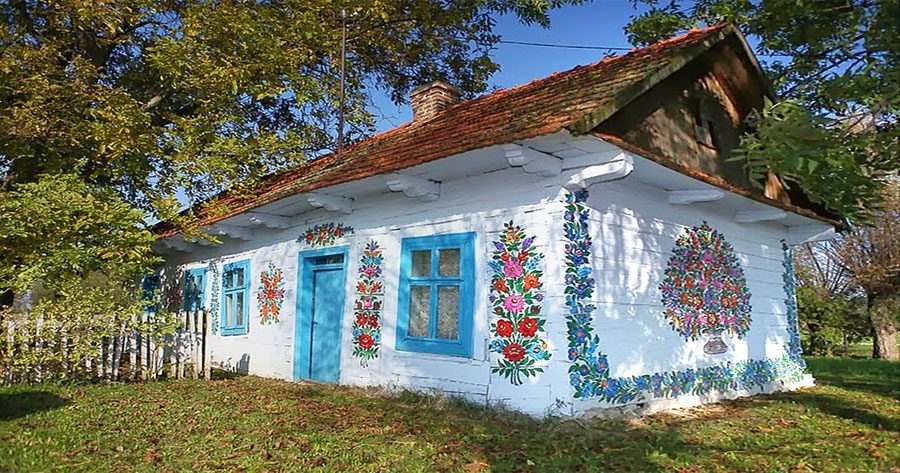 Para romper con la monotonía de los edificios blancos y cubrir las obstinados marcas negras que aparecían a través de la pintura blanca, algunas de las mujeres de Zalipie comenzaron con la creación de murales florales.