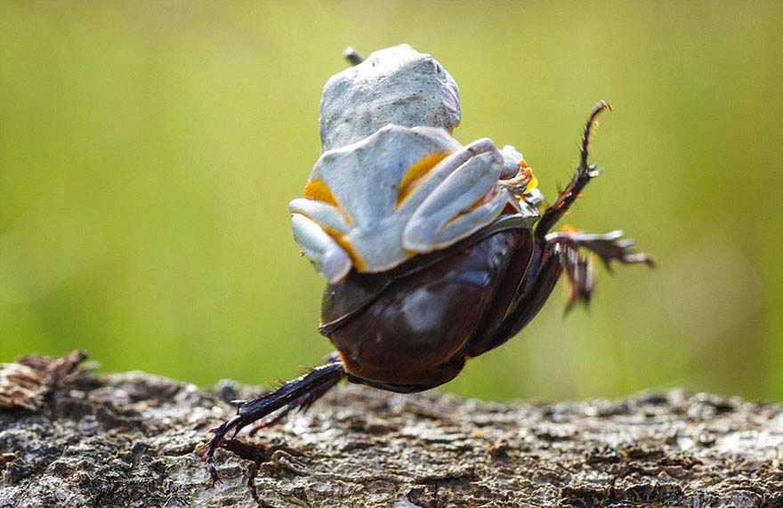 A pesar de los muchos intentos del escarabajo por escaparse, la rana se las arregló para mantenerse