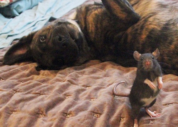 Cuando la taxidermista Mickey Alice Kwapis salvó a una rata de 4 semanas, de convertirse en alimento de una serpiente en una tienda de reptiles, no esperaba que esto sería el comienzo de una amistad poco probable. Cuando Riff Ratt llegó por primera vez a su nueva casa, tuvo que ser alimentada con biberón mientras era cuidada hasta que se pusiera sana. Durante sus sesiones de alimentación, Osiris, el perro de Mickey Alice, se sentaba a su lado y cuidadosamente lamía la leche que quedaba fuera de la pequeña rata. Osiris es un perro pastor holandés de terapia que ha ayudado a su dueña a rehabilitar a incontables animales sin hogar. «Le hemos entrenado a ser muy, muy suave. Él responde a la palabra ‘suave’«, declaró Mickey Alice. «Es el perro más dulce, y ha sido muy bueno con otros animales«.