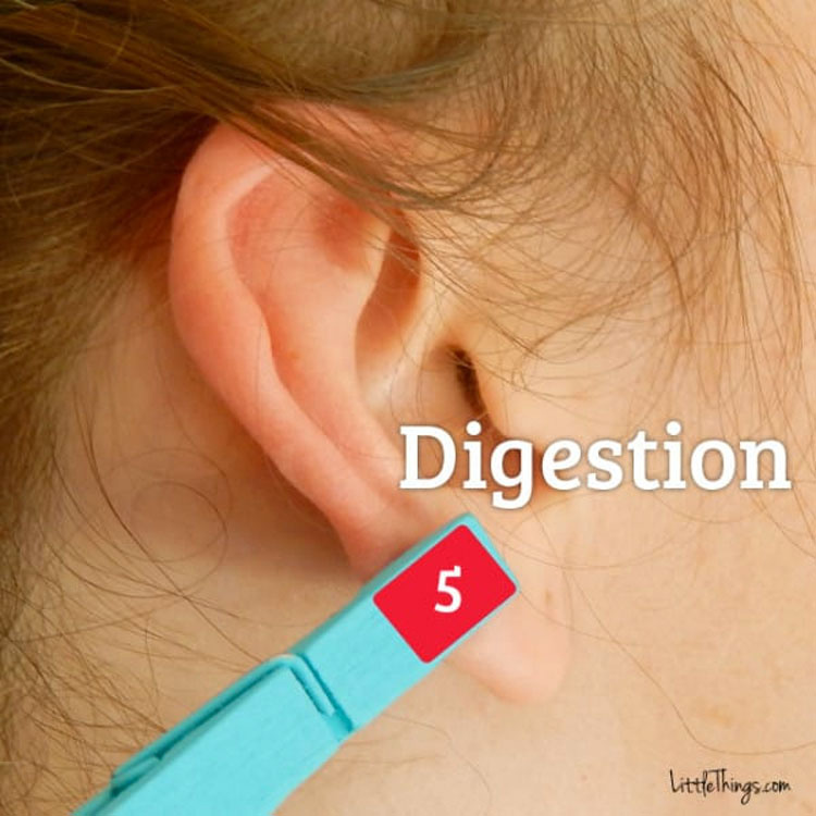 Justo encima del lóbulo de la oreja es un lugar comúnmente asociado con la digestión. El uso de una pinza de ropa para aplicar presión puede ayudar a aliviar los problemas digestivos y problemas estomacales leves. Si usted es una persona que a menudo siente molestias digestivas, puede utilizar este método con antelación para tratar de prevenir las molestias.