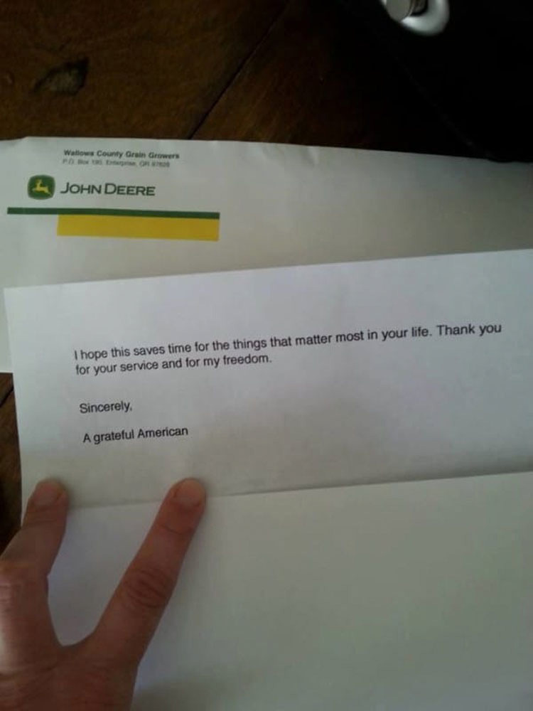 La nota era anónima, pero daba las gracias a Christopher por su servicio militar. También decía que esperaban que Christopher pudiera usar este regalo para pasar más tiempo con su familia.