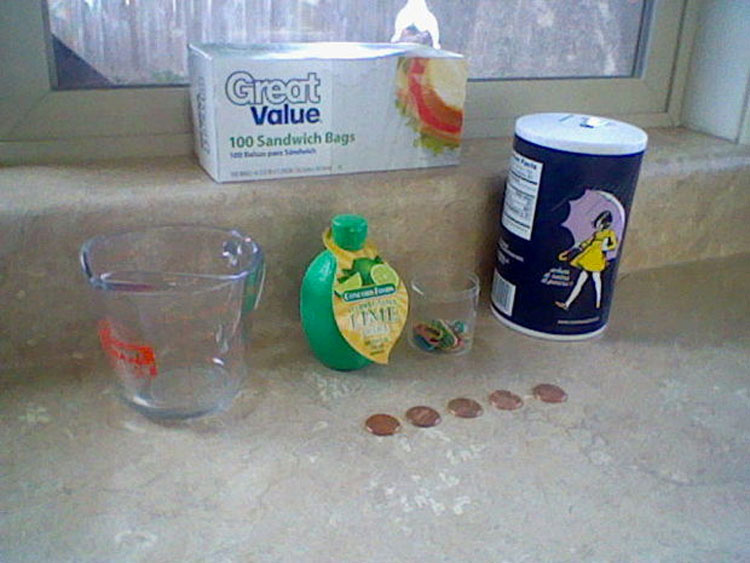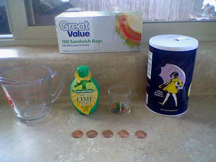 Una vez que lo hayas mezclado todo, hay que echarlo en la bolsa de plástico y añadir cinco monedas pequeñas.