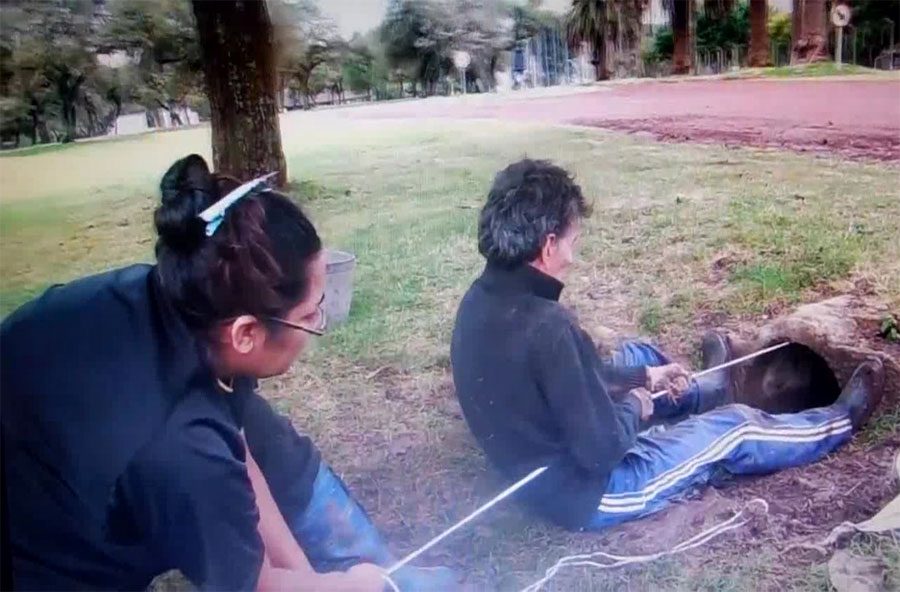 Está bastante claro que estas dos personas tienen como objetivo conseguir algo que se metió en el otro extremo de la tubería, y a primera vista parece que nunca va a llegar al final de su cuerda. Ambos tiran con fuerza, con total determinación, para sacar lo que tan profundamente está introducido. ¿Qué será?