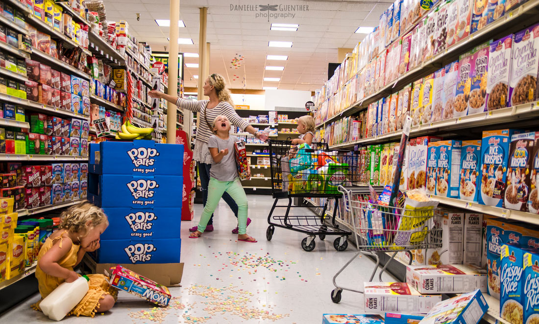 Las imágenes de Guenther capturan rivalidades entre hermanos, los desastres durante las compras, comidas desordenadas, el temor a despertar a un bebé dormido, llegar tarde a la puerta y otras escenas habituales.