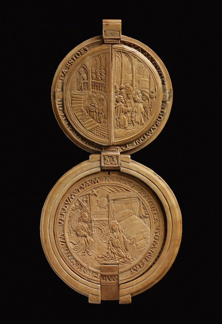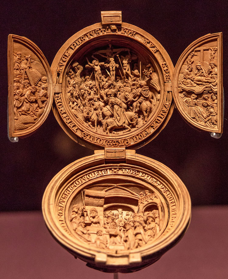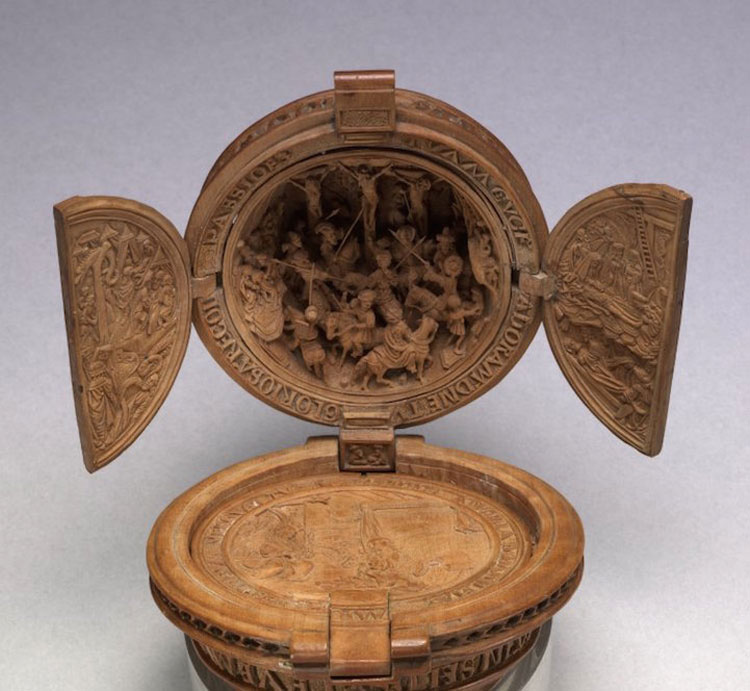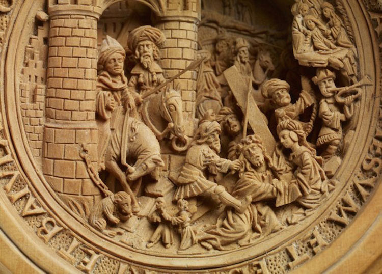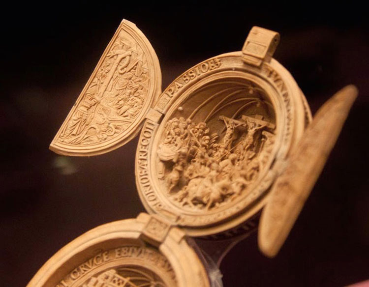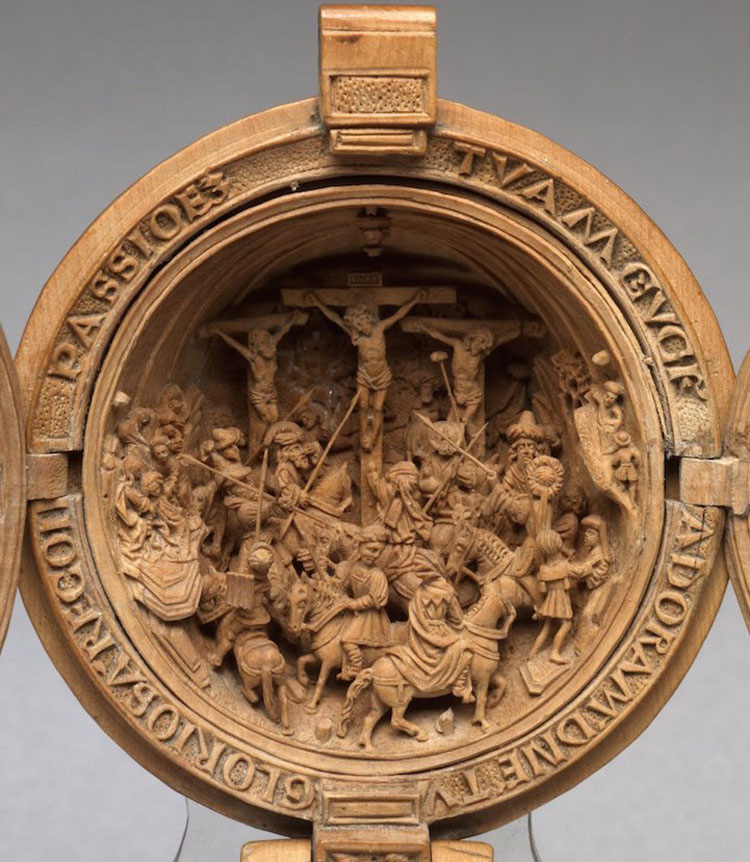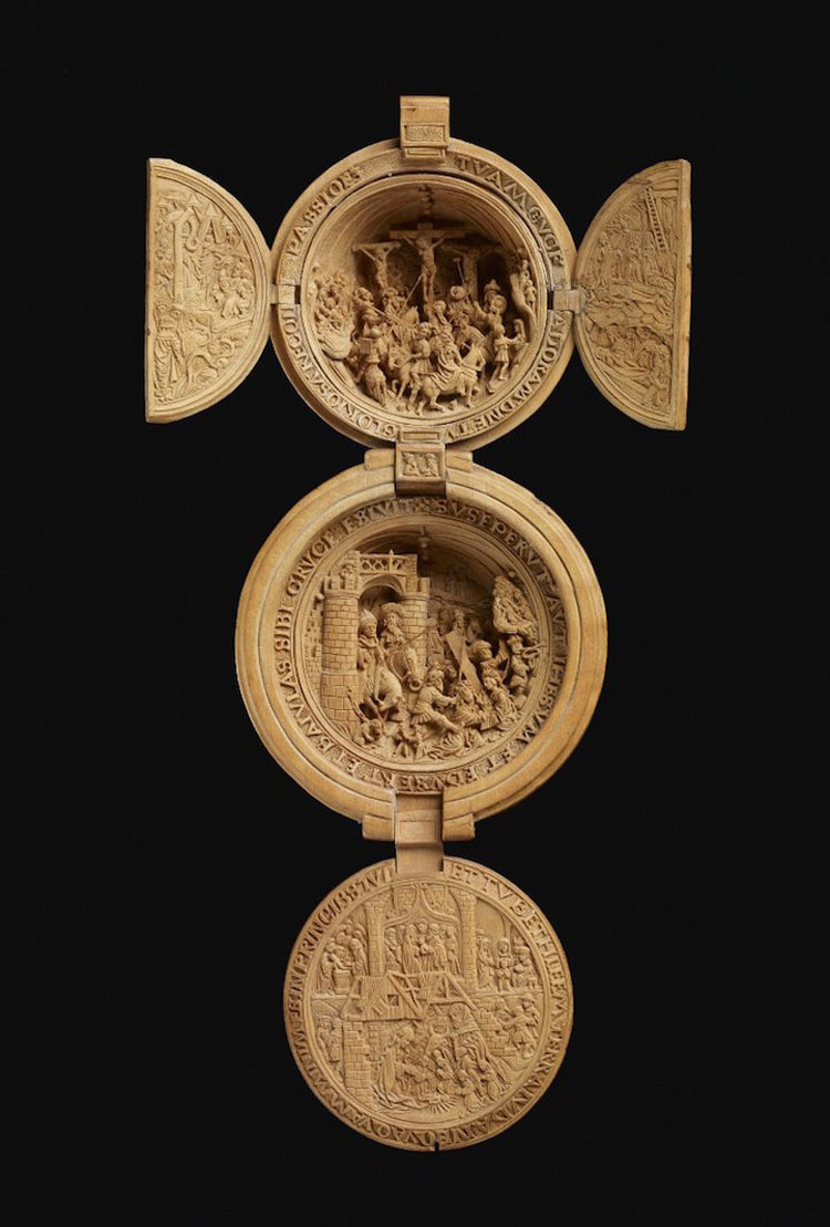 Este maravilloso rosario (llamado prayer nut, nuez de rezo) está extravagante tallado en madera de boj, se cree que fue realizado por Adam Theodrici durante la Edad Media (siglo XVI) y tenían el objetivo de ser transportados y utilizados para devoción privada. Lo tenían principalmente los ricos del norte de Europa, este tipo de rosarios eran tanto un símbolo de estatus como un signo de fe, sólo los que tenían dinero podían pagarlos.