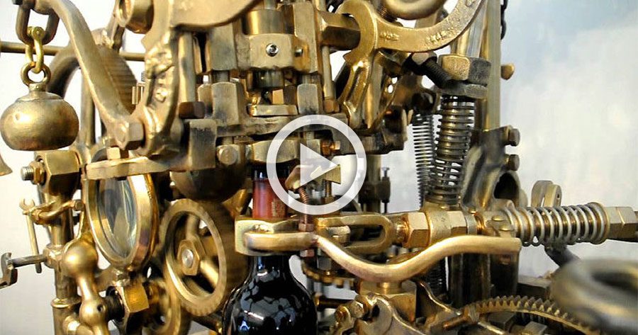 Una tonelada de chatarra, ruedas dentadas de diferentes tamaños, cadenas, muchos resortes y hasta una bala de cañon y una campana. ¿Para qué todo eso? Pasen y vean: es la máquina sacacorchos de Rob Higgs…