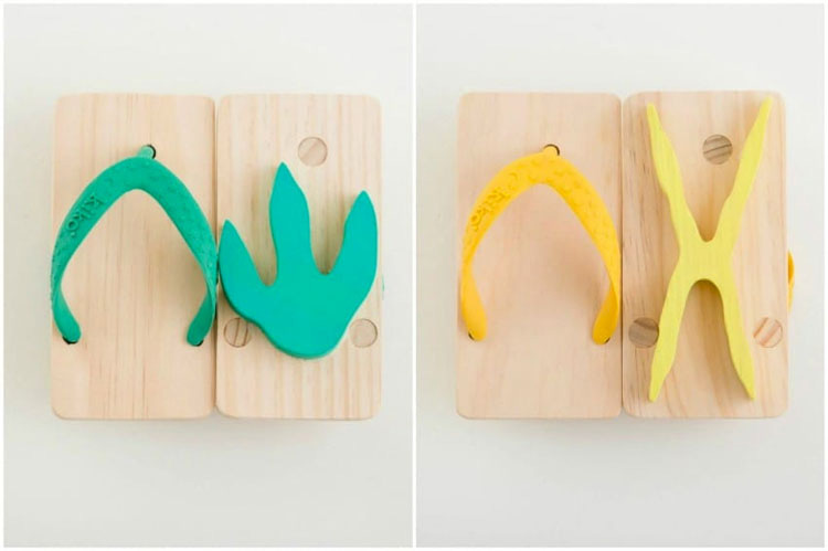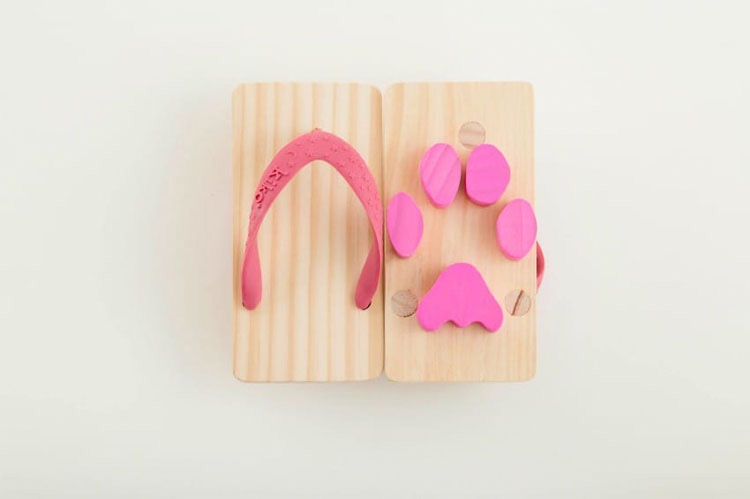 Estas sandalias de goma y plataforma de pino tienen huellas en forma de patas de animales, los modelos de huellas incluyen; perro, mono, lagartija, búho, e incluso dinosaurio.