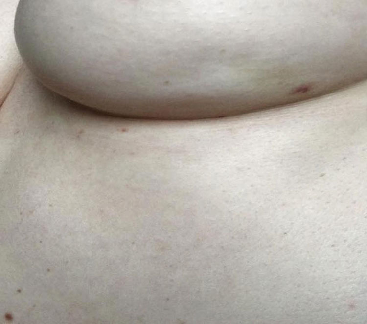 «Esta es una foto de mi teta izquierda«, explicó Claire en su post que se ha hecho viral. «El pequeño hematoma violáceo es donde me hicieron la biopsia. El hoyuelo minúsculo de arriba a la izquierda es un síntoma raro y poco conocido de cáncer de mama. Pestañea y te lo pierdes. Yo sólo lo vi gracias a otro post compartido por una amiga increíble «.