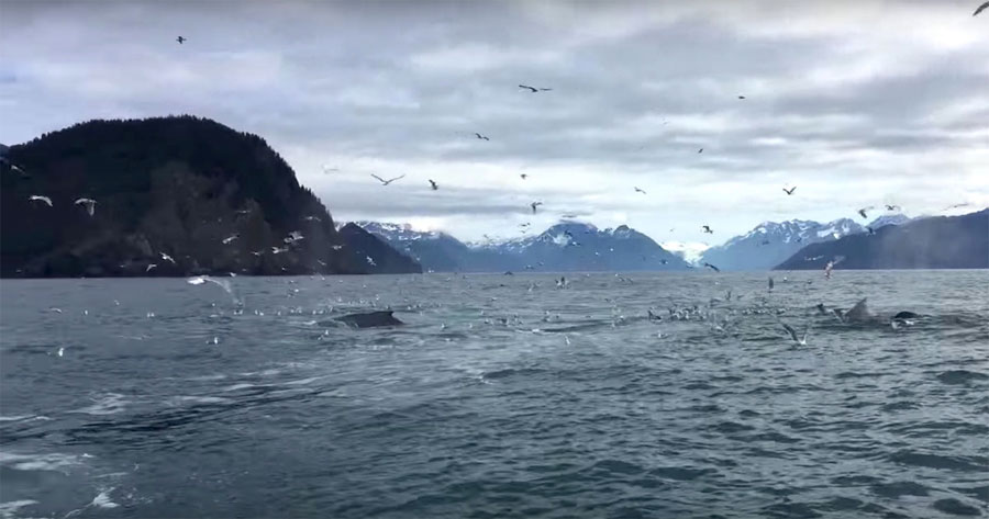 Brad Rich y sus amigos estaban en un barco frente a la costa de Seward, Alaska, pero nunca podría haber imaginado lo que se encontrarían al lado. Brad comenzó a filmar algunas gaviotas después de que él se diera cuenta de que había ballenas jorobadas debajo de ellas. Estaban bastante lejos de ellos, pero Brad tenía la esperanza de ver cómo se alimentaban. Por desgracia, no conseguía la toma – sin embargo, ¡llegó a ser testigo de como todo un grupo de ballenas aparecía justo al lado de su barco de forma repentina! Esto es una de esas cosas que suceden una vez en la vida…