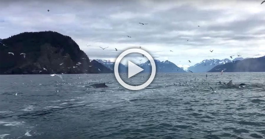 Brad Rich y sus amigos estaban en un barco frente a la costa de Seward, Alaska, pero nunca podría haber imaginado lo que se encontrarían al lado. Brad comenzó a filmar algunas gaviotas después de que él se diera cuenta de que había ballenas jorobadas debajo de ellas. Estaban bastante lejos de ellos, pero Brad tenía la esperanza de ver cómo se alimentaban. Por desgracia, no conseguía la toma – sin embargo, ¡llegó a ser testigo de como todo un grupo de ballenas aparecía justo al lado de su barco de forma repentina! Esto es una de esas cosas que suceden una vez en la vida…