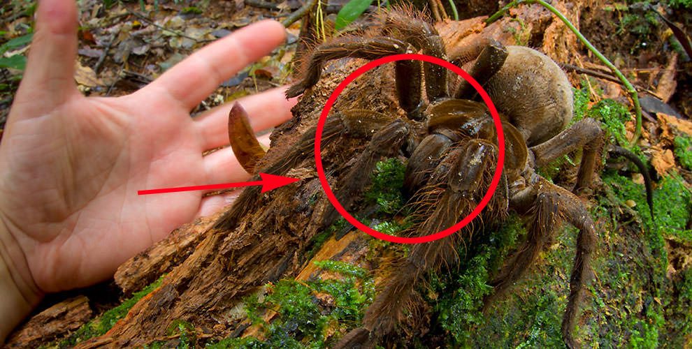 Naskrecki había tropezado con una rara criatura, casi mítica: la enorme tarántula gigante Goliat (Theraphosa blondi), la araña más grande del mundo, y probablemente la más aterradora. Sus patas tienen más de 30 cm. de largo.