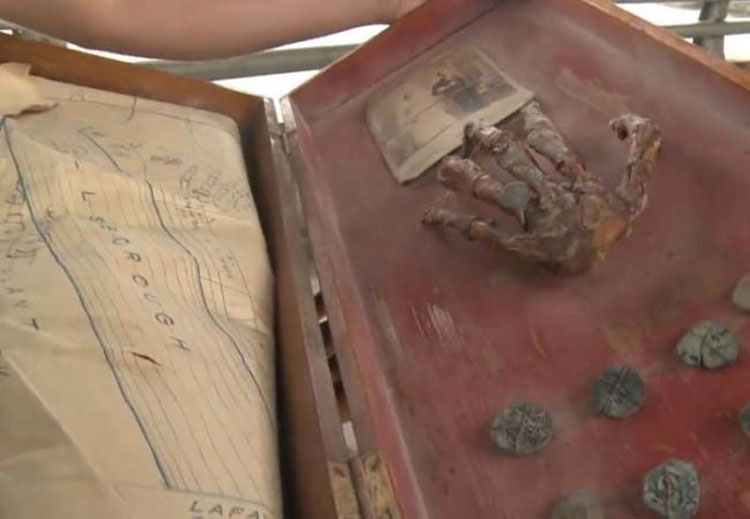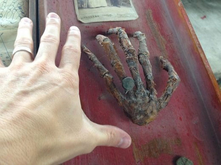 Así es, se trata de una mano humana conservada que llevaba un anillo.