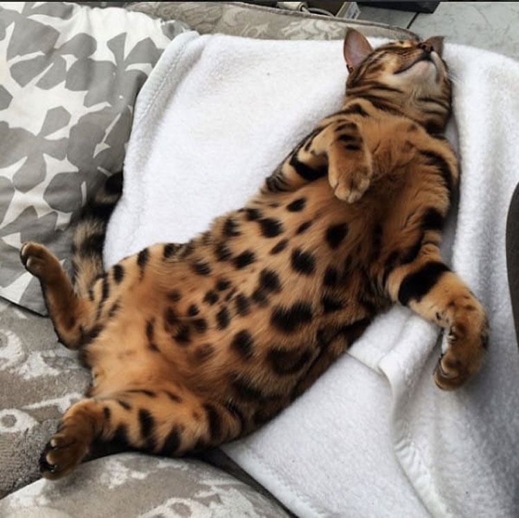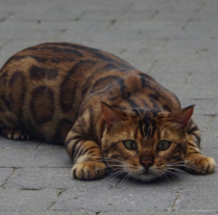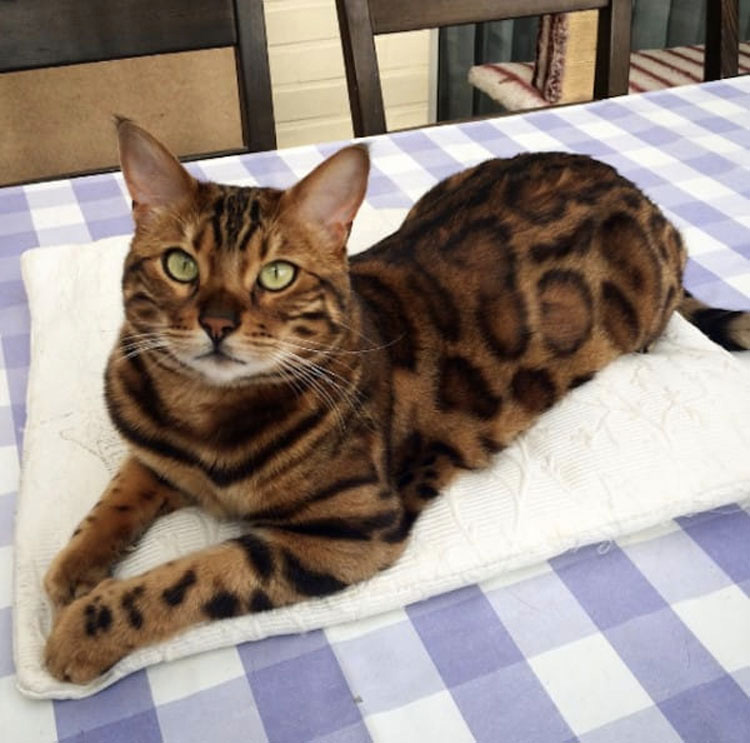 Su patrón de pelaje es diferente de otros gatos de Bengala, no sólo tiene las manchas y rayas que tienen los Bengala comunes, por eso destaca tanto y en realidad se ve como un tigre de Bengala.