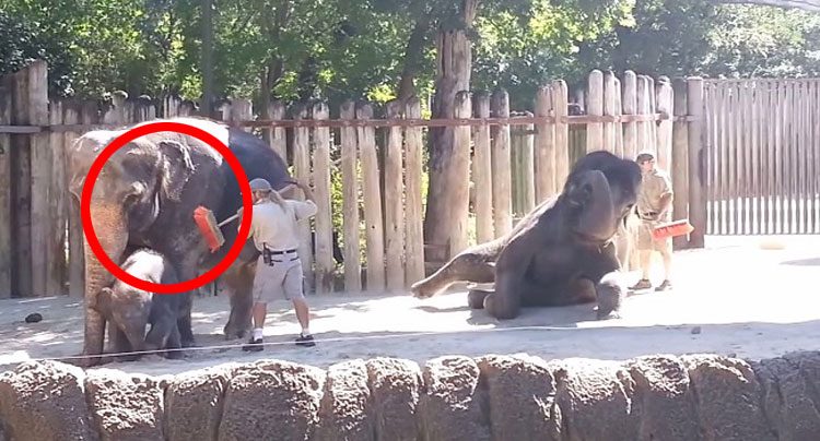 Ahora bien, si tienes suerte, como el propietario del siguiente vídeo, se llegan a ver algunos preciosos momentos de estos increíbles animales. En el video, dos cuidadores de animales cepillan la suciedad de los cuerpos de los elefantes. Pero mantenga sus ojos en el gran elefante de la izquierda… ¡Ella está a punto de hacer algo que no se puede esperar!