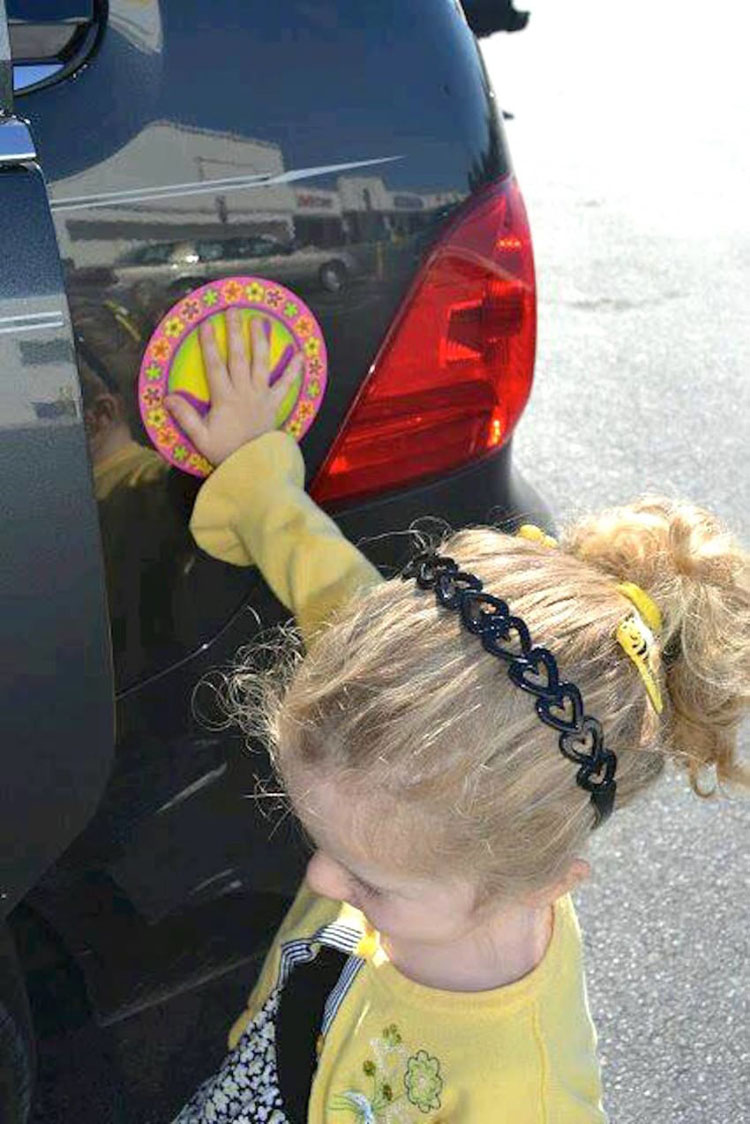 Si tiene miedo de que su hijo se escape al bajar del coche, esta idea es genial para mantener la seguridad en un estacionamiento con un juego divertido. Simplemente han de mantenerse unidos a la etiqueta con la huella de la mano en la parte posterior de su coche.