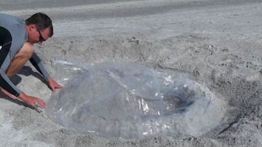 2. Cubre el fondo del agujero con el revestimiento de la ducha, asegurándote de que queda bien pegada contra el fondo del agujero. Mantenla en su lugar, enterrando los bordes en la arena.