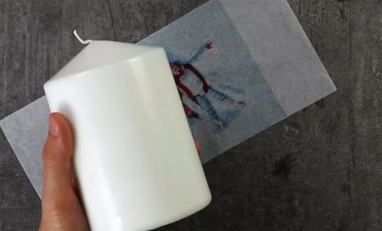 Coloca el papel con la foto en la parte central de la vela y, sobre éste, pon una hoja de papel de horno. Asegúrate de que no hay burbujas de aire debajo del papel.