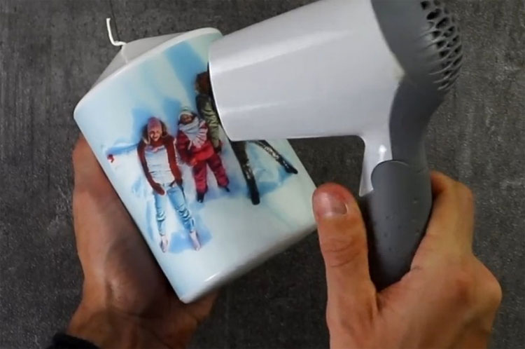 Enciende el secador de pelo y apunta a la zona de la fotografía. La capa más superior de la cera de la vela se empezará a fundir junto con el papel de seda. Si la imagen se vuelve más oscura, vas en el camino correcto.