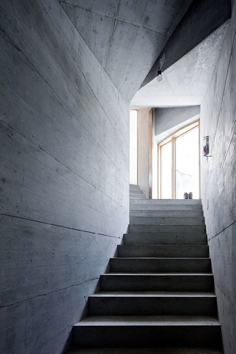 Mediante la creación de un patio amplio construido directamente dentro de una colina, esta casa ofrece una excelente vista de las pistas de esquí alpino. Incorpora un gran número de ventanas colocadas estratégicamente, porque la arquitectura de esta casa está diseñada para recibir una gran cantidad de luz natural a pesar de la rara posición de la construcción.