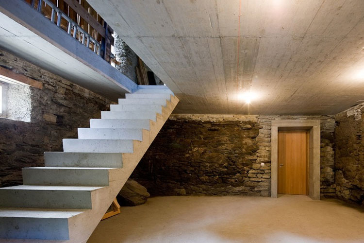 Para profundizar en la casa hay que bajar escaleras que conducen a más habitaciones con paredes de capas de piedra.