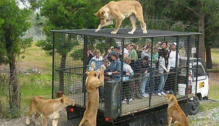 Las tablas cambian en el Orana Wildlife Park’s Lion Encounter, que pone a los turistas en jaulas para ver a los animales salvajes.